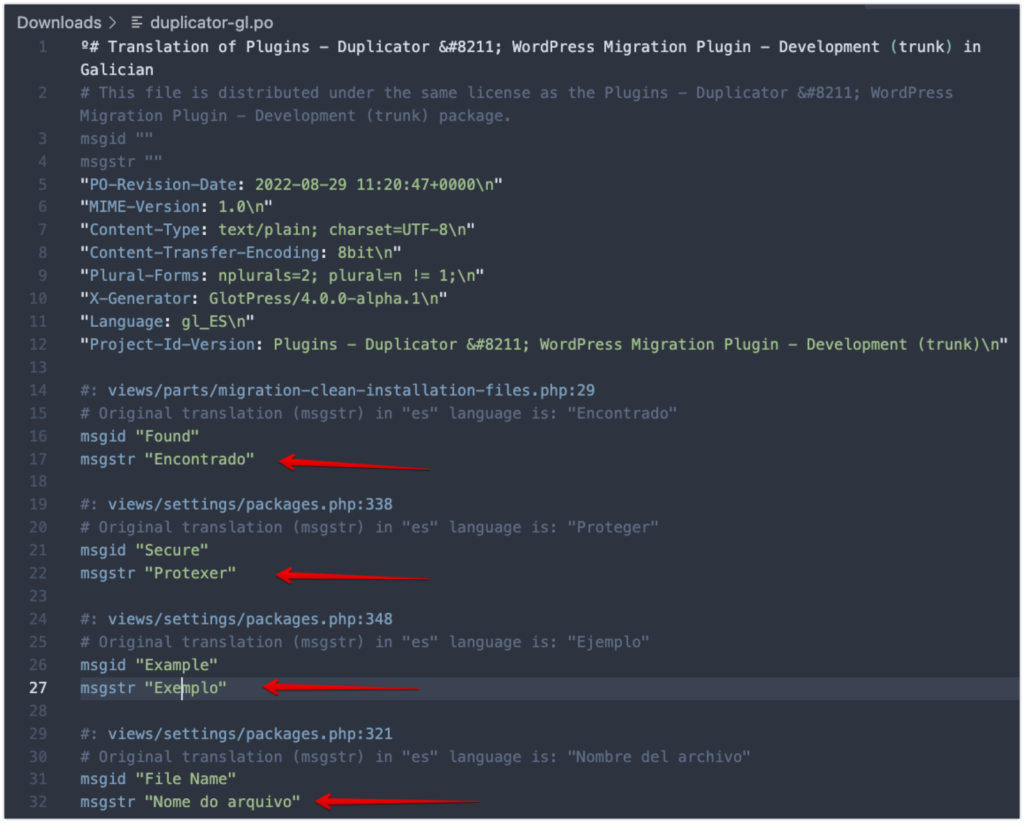Now I get a duplicator-gl.po file. I can open it with a translation tool like Poedit. I use Visual Studio Code with the gettext extension, that adds syntax highlight to po, pot and potx files.