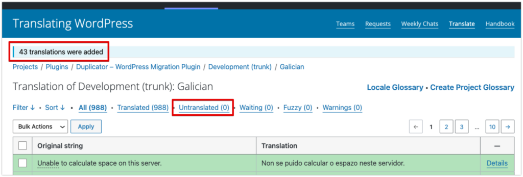 After a few seconds, I have “43 translations added” (because the Galician plugin only had 43 strings untranslated) and the plugin full translated.